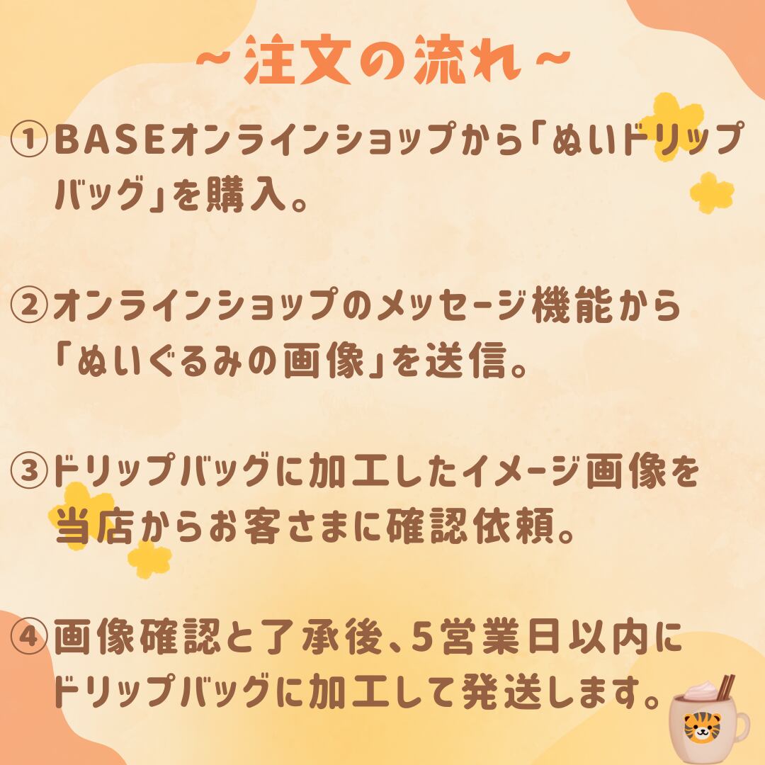 ・お客さまの画像確認と了承後、5営業日以内にドリップバッグに加工して発送します。