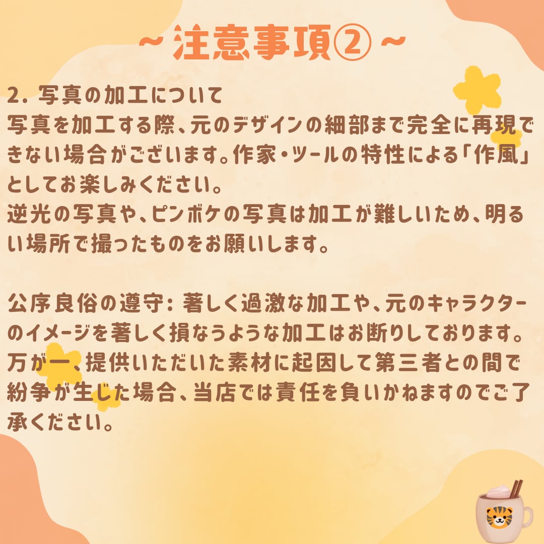 公序良俗の遵守: 著しく過激な加工や、元のキャラクターのイメージを著しく損なうような加工はお断りしております。